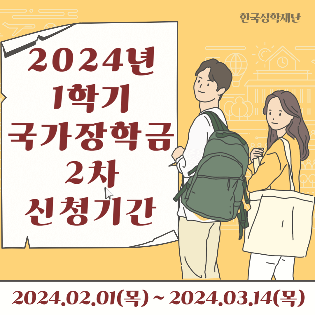 - 2024학년도 1학기 국가장학금 2차 신청은 2월 1일 오전 9시부터 3월 14일 오후 6시까지 진행됩니다.